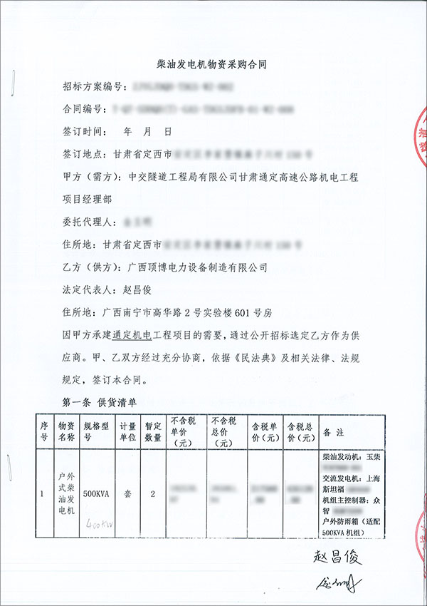 近日,中交隧道工程局有限公司因承建甘肅通定高速公路機(jī)電工程項(xiàng)目需要,與我司廣西頂博電力設(shè)備有限公司成功訂購(gòu)400kw/160kw/504kw玉柴柴油發(fā)電機(jī)組共5套,其中400kw玉柴柴油發(fā)電機(jī)組共2套,選配戶外防雨箱;160kw戶外式玉柴柴油發(fā)電機(jī)組1套,選配戶外防雨箱;504kw玉柴柴油發(fā)電機(jī)組2套,頂博電力與中交隧道工程局已進(jìn)行多次合同,十分感謝貴公司對(duì)頂博電力的支持與認(rèn)可!