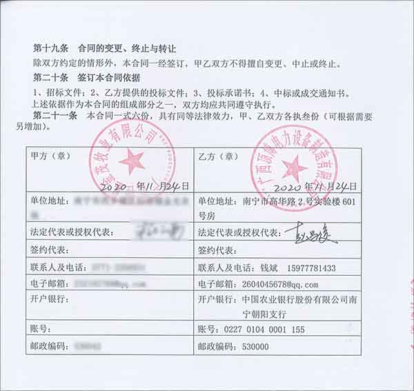 熱烈祝賀廣西頂博電力設(shè)備制造有限公司與廣西桂墾金茂牧業(yè)有限公司于2020年11月24日成功簽訂7臺(tái)