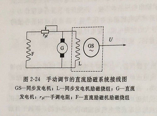 這是交流同步發(fā)電機(jī)采用的傳統(tǒng)助磁系統(tǒng)。直流勵(lì)磁機(jī)一般又有同軸式和背包式兩種形式,如圖2-24所示為手動(dòng)調(diào)節(jié)的直流勵(lì)磁系統(tǒng)接線圖,勵(lì)磁機(jī)為并勵(lì)直流發(fā)電機(jī),通過(guò)手動(dòng)調(diào)節(jié)磁場(chǎng)變阻器,改變勵(lì)磁機(jī)的輸出電壓,以調(diào)節(jié)同步發(fā)電機(jī)勵(lì)磁繞組中的電流,從而改變同步發(fā)電機(jī)的輸出電壓。
