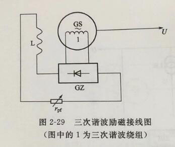 除了他勵(lì)和自勵(lì)兩類主要的半導(dǎo)體勵(lì)磁方式外,還有一種介乎兩者之間的所謂諧波勵(lì)磁系統(tǒng)。在主發(fā)電機(jī)定子槽中嵌有單獨(dú)的附加繞組,稱為諧波繞組。利用發(fā)電機(jī)氣隙磁場(chǎng)中的諧波分量,通常是利用三次諧波分量,在附加繞組中感應(yīng)揩波電勢(shì)作為勵(lì)磁裝置的電源,經(jīng)半導(dǎo)體整流后供給發(fā)電機(jī)勵(lì)磁。如圖2-29所示。諧波勵(lì)磁方式有一個(gè)重要的有益的特性,即諧波繞組電勢(shì)隨發(fā)電機(jī)負(fù)載變動(dòng)而改變。