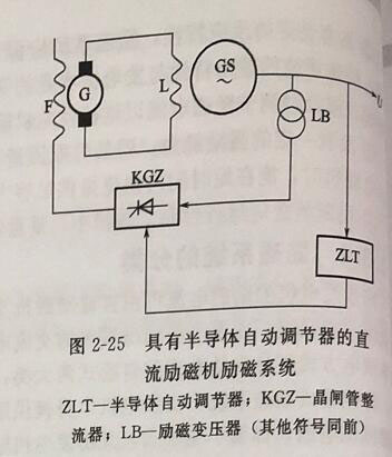 如圖2-25所示為具有半導(dǎo)體自動(dòng)調(diào)節(jié)器的直流勵(lì)磁機(jī)勵(lì)磁系統(tǒng)。自動(dòng)工作時(shí),同步發(fā)電機(jī)的勵(lì)磁電流由自動(dòng)調(diào)節(jié)器按同步發(fā)電機(jī)運(yùn)行情況自動(dòng)調(diào)節(jié),調(diào)節(jié)信號(hào)由同步發(fā)電機(jī)的輸出端取得。過(guò)去在直流勵(lì)磁機(jī)的勵(lì)磁回路中串入碳阻式調(diào)節(jié)器代替手調(diào)電阻,現(xiàn)在已被晶閘管半導(dǎo)體自動(dòng)調(diào)節(jié)器所代替。