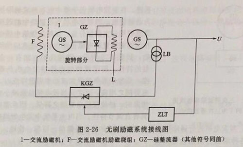 上述③、④兩種方式,硅整流元件和交流勵(lì)磁機(jī)電樞與主軸一同旋轉(zhuǎn),直接給主機(jī)轉(zhuǎn)子勵(lì)磁繞組供勵(lì)磁電流,不但取消了直流勵(lì)磁機(jī)系統(tǒng)中的換向器-電刷結(jié)構(gòu),而且取消了與朝步發(fā)電機(jī)勵(lì)磁繞組相連的集電環(huán)-電刷結(jié)構(gòu),故稱為無(wú)刷勵(lì)磁(又稱無(wú)觸點(diǎn)勵(lì)磁或旋轉(zhuǎn)半導(dǎo)體勵(lì)磁)方式。交流勵(lì)磁機(jī)的勵(lì)磁繞組固定不動(dòng),其接線如圖2-26所示。有的發(fā)電機(jī)在定子上設(shè)置一個(gè)沒(méi)有勵(lì)磁繞組的磁極,它是用優(yōu)質(zhì)的永磁材料制成,作為初始磁場(chǎng)起勵(lì)建壓。